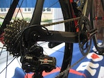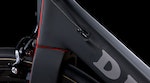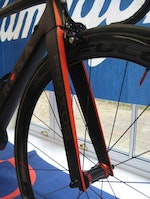 Frame weight is 800g, shaving 150g off the frame used on a De Rosa bike unveiled in 2006 and bearing the same name. The matt black and red highlights make for a stunning finish, with De Rosa’s trademark heart slapped on the downtube. Talking of the downtube, the cross section with the bottom bracket is one of the fattest we’ve seen. That’ll be stiff – and fast. Particularly interesting is the flat fronted fork, which somewhat balks in the face of the aero trend that is sweeping the industry.