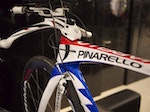 In close proximity hangs a Pinarello Graal time trial machine in red, white and blue, with British Cycling branding. Wiggins won a silver medal at the world time trial championships on an identical machine last October.
