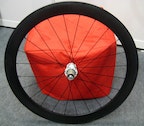 The Bullet range is Campagnolo’s collection of carbon wheels with an aluminium braking surface. Pictured above on the Chicken Cycle Kit stand is the Bullet Ultra 80. It has a rim depth of 80mm, with corresponding 50mm and 105mm options also available. The rims are specially developed by Campag to maximize aerodynamic efficiency and minimize buffeting in crosswinds, with the Italian manufacturer’s anti-rotation spoke system keeping the rim, spokes, alloy nipples and cup-and-cone hub properly aligned, while oversized drive-side flanges increase torsional stiffness. Claimed weight is 815g front and 955g rear and you also get wheel bags for your money (£1299.99, if you’re wondering).