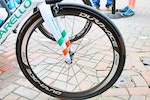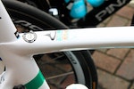 Instead, the green, white and orange-striped jersey is being showcased at the Tour of Britain, with Roche’s Pinarello Dogma F8 decorated in matching livery.