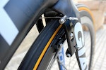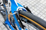 The front brake is neatly hidden behind the fork. Blanco riders use custom-machined aluminium brake arms, rather than the stock carbon version specced on production models of the Propel, as it provides a stiffer response but, more importantly, can more easily accommodate wider rim profiles