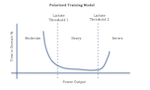 As you can see from the model below, an athlete following a polarised plan will minimise the amount of time spent in the heavy zone, instead spending most of their time in the moderate zone and a higher percentage in the severe zone.