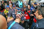 Team-mate and compatriot Lucasz Wisniowski congratulates Kwiatkowski – the first Polish winner of Milan-San Remo (pic – LaPresse-RCS Sport)